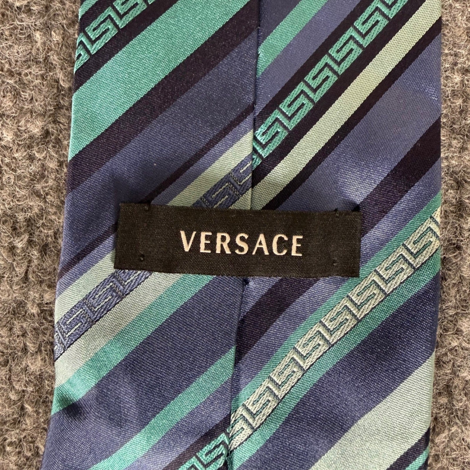 Versace Silk Tie Men Blue Green Greek Key Stripe Made in Italy Luxury Designer